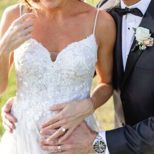 Also purchased and added $500 special detailed beaded straps to match the dress better, tried to show them close-up in photos. I loved them so much more than the cheap-feeling straps that were standard. I also had the bustle added, and I have a video to show you how to do the bustle.