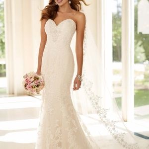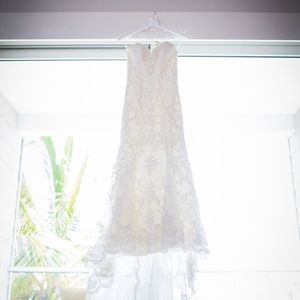 Beautiful Stella York fit and flare strapless wedding dress. Lace, beading, and satin. Altered to fit the body. Has B cup padding inside which can be removed. Beautiful lace train. Worn once and in excellent condition. Belt not included.