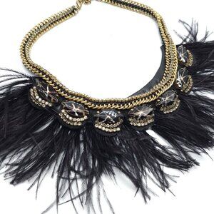 This statement necklace from Stella & Dot combines luxurious black feathers with sparkling rhinestones and a gold chain for an elegant and bold look. It's designed to enhance any outfit, making it suitable for occasions that call for sophistication and style. The intricate detailing and unique design reflect a blend of modern fashion and timeless elegance, perfect for standing out in a crowd.