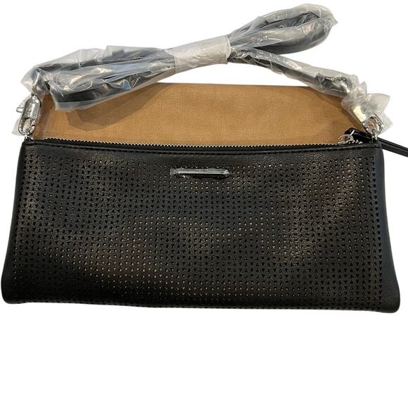 Stella and Dot 9"x6" (folded) Waverly Petite perforated Black Handbag with Pale Caramel Interior NWT