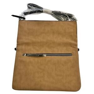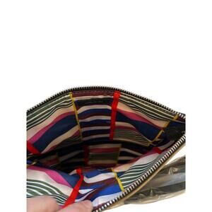 Zippered closure, zippered back pocket, rem,ovable / adjustable strap. 9x6" when folded. Colorful cloth interior pocket.