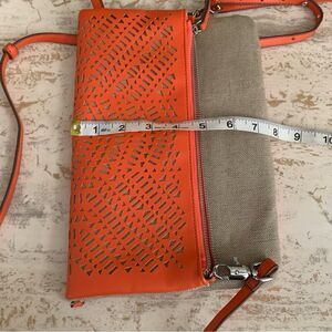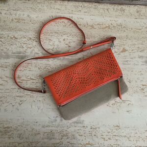 Stella and Dot Waverly petite Crossbody in fresh orange and neutral. Gently used. Crossbody can be worn fold it over or you can move the strap up to the top D rings for a larger size Crossbody. You also remove the straps and wear it as a clutch.beautiful cut out design. Retail price $104