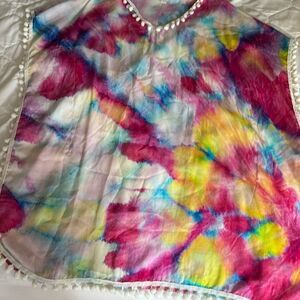 Stella Cove Color-burst tie dye Pom Pom girls beach coverup poncho. Features V neckline trimmed in white pom poms. Sides are open with Pom Pom trim.