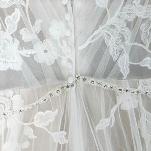 This A-line wedding gown from Stella York is a sheer dream! Delicate tulle with organza underlay creates a crossover feature along the bodice, with ruched gathers toward the banded waist for a sheer effect and flattering texture. Large-scale floral laces are thoughtfully placed throughout the bodice and in gently curved vine-like structures throughout the skirt. A subtle V-neckline with wide straps and an open V-back add the perfect touch of classic femininity to this romantic piece, with soft shimmer detailing showered throughout the silhouette for a dewy radiance. Finally, the soft tulle train flows out from behind for a lightweight, frothy finish.