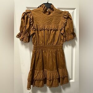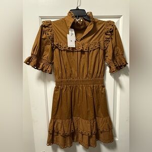 Retailed for $206. Never worn and has tags. Chic brown dress with ruffled details. Perfect for any occasion.