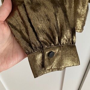 Shimmering gold button down shirt. Long sleeves. Classic collar. Perfect for a night out.