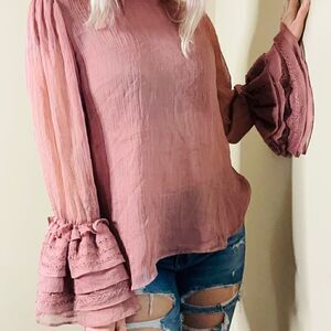In good gently used condition! Beautiful dusty rose/pink color. Semi-sheer but does have two layers that prevent it from being fully see-through. Amazing exaggerated ruffled bell sleeves. Zips partially up the back. Has a relaxed & flattering fit! Would make a beautiful Valentines Day top! Very faint mark on front and on collar. Not noticeable when wearing. I did not try to remove. Size medium