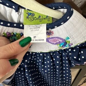 Stellybelly peacock smocked dress ruffles embroidered polka dots navy toddler