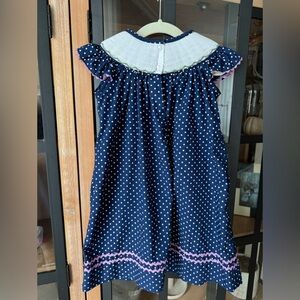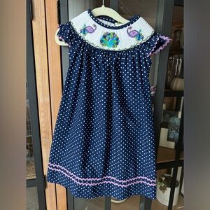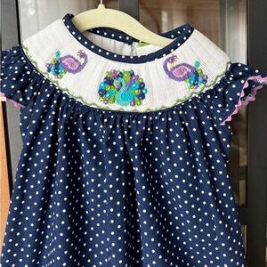 Size 2T toddler girl Navy polka dots peacock embroidered smock plate