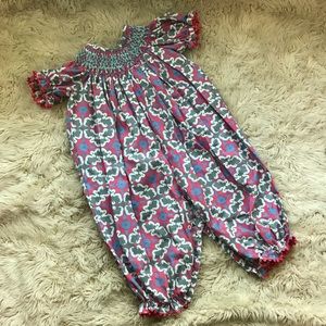 Smocked pants one piece romper for girls size 18 months. Hot pink and grey pattern. Snaps at bottom. Perfect condition. Hardly worn.