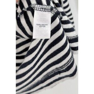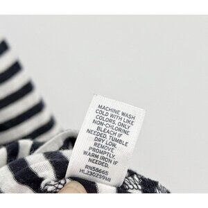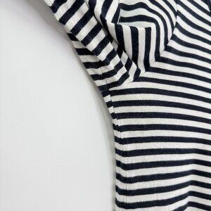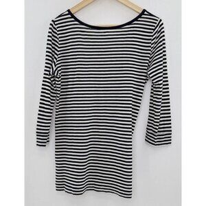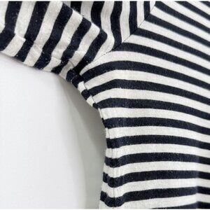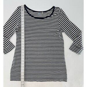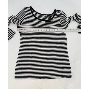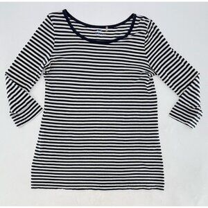 This black and white striped organic cotton shirt from Old Navy is a versatile addition to any woman's wardrobe. With a crew neck and 3/4 sleeves, it offers a classic yet modern style suitable for casual occasions. Made from comfortable knit fabric with a pullover closure, this t-shirt is machine washable and perfect for all seasons. The size M shirt features a regular fit and is designed for a comfortable and stylish look in the winter, fall, or spring. Wash wear to shirt. A couple wear holes in shirt. Please see photos for a better representation. Please feel free to ask any questions