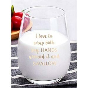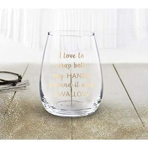 Funny words are stamped in Gold “I Love to Wrap Both My Hands around It and Swallow” this adds a touch of humor to this wine glass.