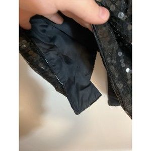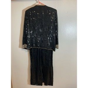 Stenay M Silk Sequin Black Blazer Skirt Combo Beaded Vintage Swinger Flapper Material: silk, sequins, beads Features: blazer and skirt combo, sequins, padded shoulders, hook closure on front, elastic waistband on skirt, long skirt length, vintage Flaws: Skirt elastic waistband is not quite so stretchy and it was altered for a smaller waist. May need further alteration or replacement. Measurements (measured flat, in inches, approximate)(refer to drawing template on how I measure): Chest: 19 Length: 25 Sleeve: 22 Waist: 17 Length: 39 Ready for you! Comes from a home free from smoke or pets. I ship after receiving cleared payment. Thanks for looking and happy shopping!