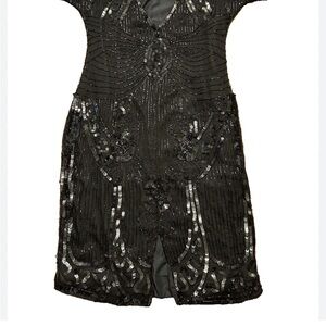 Cocktail dress, gala special occasion, date night anniversary, black glitter open back vintage glam glamour Hollywood glam great Gatsby Unique Rare Party Dress