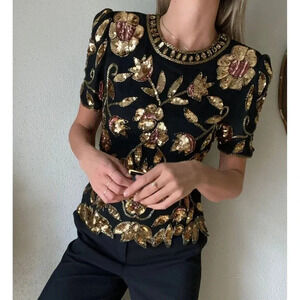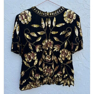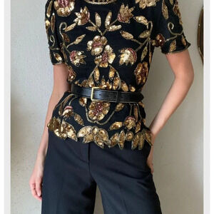 Stenay Vintage Short Sleeve Retro Sequined Blouses Top Black Gold Sz 14