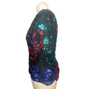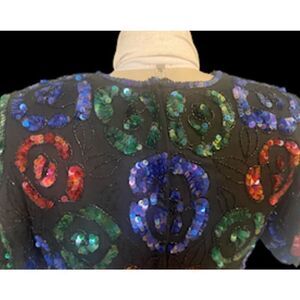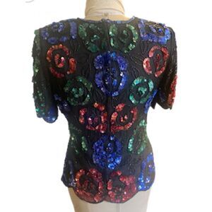 Beautiful vintage sequined and beaded silk top by Stenay. Back zip, V-Neck, lined and short sleeves. Beautiful sequined design. BIn excellent condition.