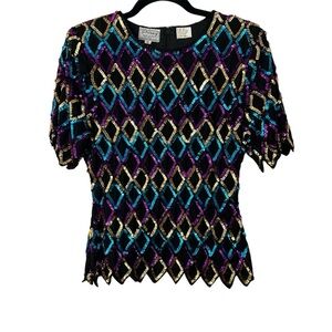 Stenay Women’s Short Sleeve Multicolor Diamond Sequin 100% Silk Top Size S GUC