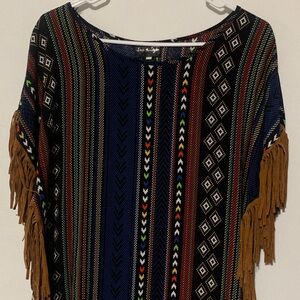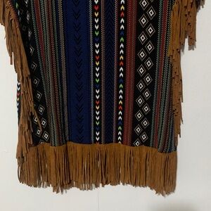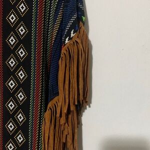 Bohemian knit poncho top with fringe details. Features a mix of blue, brown, and multicolor patterns.