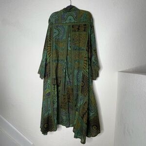 Step In Style NWT Long Sleeve Button Down Asymmetric Hi Lo Lagenlook Boho Dress Sz One Plus Green Patchwork Geometric Pattern Collared