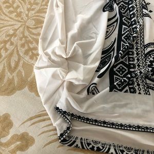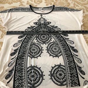Flowy top that can be used as a beach xo your with your favorite bottoms for a relaxed look…black trim and design with random,light sequence…just enough to dress it up and catch the light without going overboard, back has the same design minus the sequence…side at hem has two tucks to round up the side and give movement…excellent condition