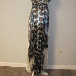 Step in style peacock feather print dress. Satin. Adjustable straps. Empire waist, lightly padded bust. A line fanned skirt. Smocked back. 11" across back unstretched, 43" long. One size fits most. Brand new with tags. I am happy to answer any questions.