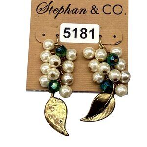 Stephan & Co. Faux Pearl Green Beaded Leaves Cluster Dangle Drop Earrings Boho