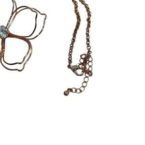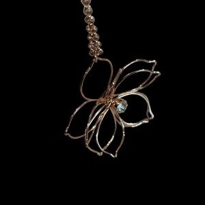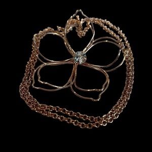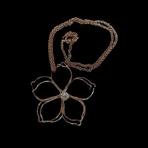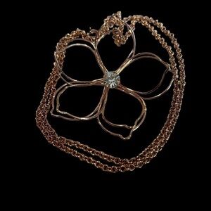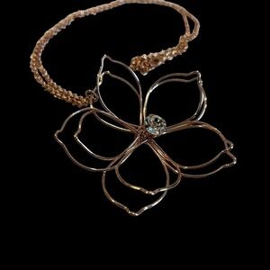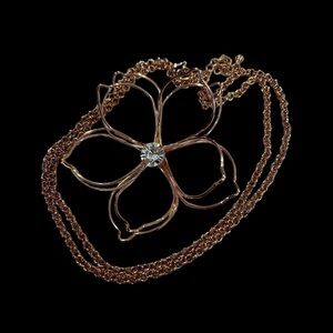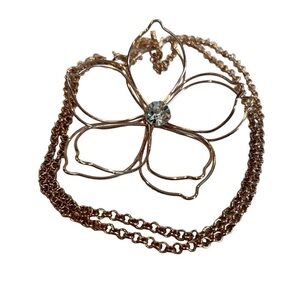 This Stephan and Co. necklace is new without tags and is a beautiful rose gold color with a three dimensional metal wire flower pendant with a large rhinestone center. I tried my best to get pictures to show its beauty but the photos do not do it justice. The chain length is 14” with 3” of additional chain to make longer. The pendant is 3” wide and aprox. 1” in depth.