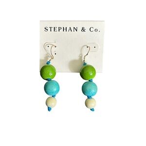 Stephan & Co. three bead drop pierced earring in this year’s trendiest colors of blue and green! Made of wood and knotted at bottom this pair of earrings will go with so many of the fashions out this year! Perfect for the shore, beach, vacation, cruise, day or evening events, or just everyday attire! they are 2” in length.