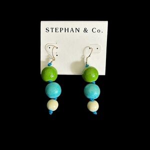 Stephan & Co. three bead drop pierced earring in this year’s trendiest colors of blue and green! Made of wood and knotted at bottom this pair of earrings will go with so many of the fashions out this year! Perfect for the shore, beach, vacation, cruise, day or evening events, or just everyday attire! they are 2” in length.