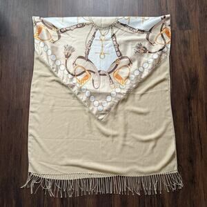 Elegant Stephan Made in Italy scarf/shawl crafted from a luxurious blend of cashmere and silk. Features an equestrian-inspired print with bridles, bits, and tassels in warm tones on a neutral base. Large size makes it versatile for wear as a wrap, shawl, or oversized scarf.