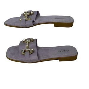 stephan paris shoes, lilac sandals, rhinestone slides, new wedding guest shoes, lavender slip-ons, bridal brunch outfit, horsebit sandals, summer vacation shoes, square toe flat sandals, pastel wedding flats, new with tags style