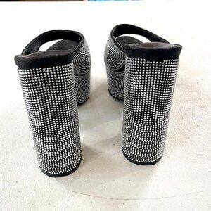 Make a show-stopping entrance with these incredible Stephan Paris platform mules. These heels are absolutely covered in thousands of sparkling crystal rhinestones from the strap to the massive chunky block heel and platform.