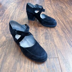 Gorgeous shoes by French designer Stephane Kelian Paris. Platform style in soft black suede leather ft criss-cross straps and chunky block heel. Heel height 2.75“, platform height .75“. Size 8, excellent preowned condition.