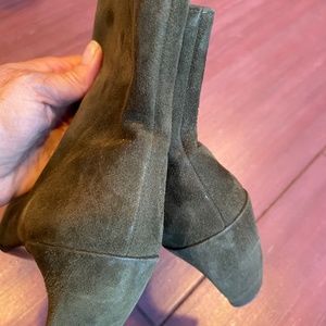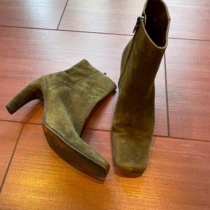 Stephane Kelian suede ankle boots. Size UK5 which equates to US size 7. Olive green super soft suede. Side zipper. Leather soles. Square toes. 4" suede wrapped curved heels. Made in France. Boots have wear but lots of life left in them -- scuffs in suede (see photos #2, 6, 9 and 10), wear on soles, and normal creasing in leather.