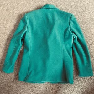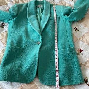 Here is a seafoamy, or minty green single-button blazer by Stephanie Andrews. It is in GUC, but does show wear on inspection. It has 2 functional front pockets, and one faux pocket at upper left. It has small shoulder pads sewn in, that you can feel. No stains or holes.