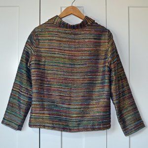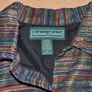 Stephanie Andrews silk metallic lined jacket P Med. Gorgeous silk blend and metallic jacket, fully lined, always earns compliments, unique. Beautiful condition. Lightweight, not bulky, perfect in spring or summer when you want to look finished but feel comfortable. Button front. 52% silk 39% cotton7% metallic 2% rayon. Back length 22” – width across chest at underarm 21-1/2” – sleeve length from shoulder 22”. Nonsmoking home.
