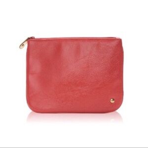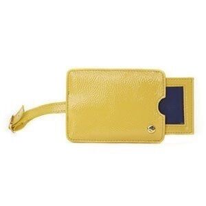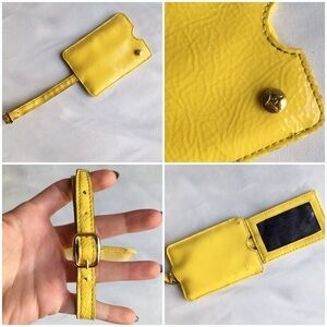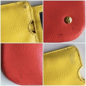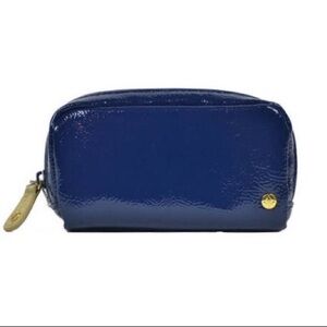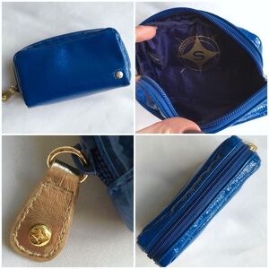 Stephanie Johnson Malibu collection travel set which includes 2 bags and a luggage tag. All crinkled patent leather. The blue pouch is a small zip around bag with a gold zipper pull. (Retail $30) 4"H x 6"W x 2"D. The coral bag is a flat pouch with top zipper and gold pull (Retail $30) 7"W x 5"H. The yellow luggage tag has a cover that slides over a clear part (Retail $18) 8"H x 5.5"W. All have been used and there are some minor signs of wear (see last picture).