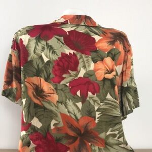 Stephanie K a division of Koret brand. Hawaiian shirt with classic flowers and button down front. Buttons appear to be made of wood.
