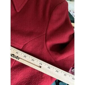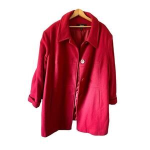 The coat features long sleeves, lined interior, and pockets for added convenience. The red color adds a pop of charm to the classic design. Perfect for plus-sized women, this overcoat is ideal for anyone looking for a timeless piece that can be worn for years to come.