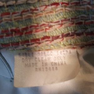 This is a STUNNING boutique piece by designer Stephanie Schaich, featuring a sage and multi-color/some metallic thread, woven cropped blazer, cotton lined, with classic collar, exposed zipper front, satin trim, chain zip on pockets, deconstructed chiffon floral trim at hem and wrists. Perfect for career or going out wear