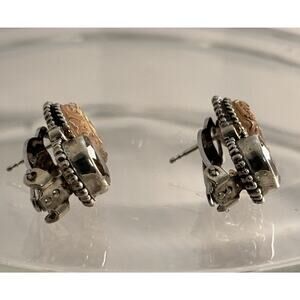 These earrings by Stephen Dweck feature a lovely design with an oval flower of carved crystal and a faceted smoky quartz stone, set in sterling silver. Signed by the designer, these earrings are a stunning addition to any jewelry collection. The earrings were originally clip, but have been altered and are now omega backed. Photo #3 gives the best representation of the color of the stones.