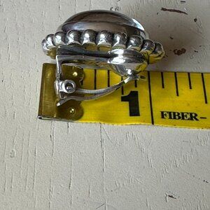 Opalescent stone subtly changes colors in light. Sterling silver beading surrounds stone, clear quartz set in bezel. From private collection and have been worn, stored, In never worn condition. Hallmark and Sterling Silver designation on back. Designed to be comfortable clip-ons. Excellent Condition as all Rebecca Colling Collection of mine is.