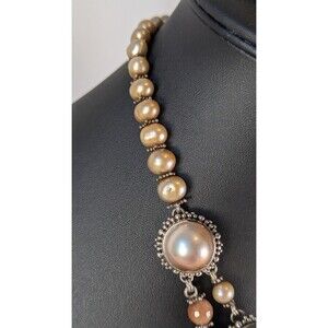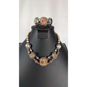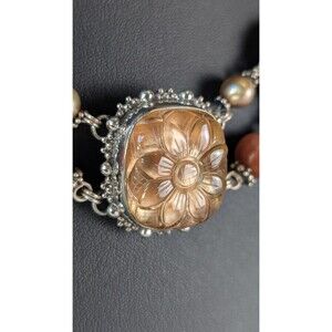 Stunning Stephen Dweck vintage necklace and bracelet set from the Terraquatic line. This masterfully designed necklace and bracelet set features hand-carved quartz, large freshwater pearls, smoky quartz, and other natural gemstones, all set in solid sterling silver. The silver itself boasts exquisite detail and accents throughout, including the signature Stephen Dweck signature on each segment. You could examine this necklace and bracelet set over and over again, and each time you will find something new to appreciate. It is truly a remarkable work of art.