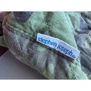 This is a pre-owned Stephen Joseph quilted backpack in a green camouflage design. The bag measures approximately 11 inches in height, 12 inches in width, and 4.5 inches in depth. Made from 100% cotton twill with polyester lining and padding, it features adjustable straps, a drawstring closure, a secure flap top, and an exterior zip pocket. The backpack is lightweight and perfect for casual use. The item is in good used condition with some signs of wear on the straps and is machine washable. See photos for details. Made in Guangzhou, China.