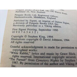 Stephen King's "Insomnia" offers a gripping tale of mystery and suspense set in Derry, Maine. This paperback edition, first printed by Signet in 1995, presents a chilling narrative that will captivate readers with its intricate plot and compelling characters. A must-read for fans of horror and supernatural thrillers.