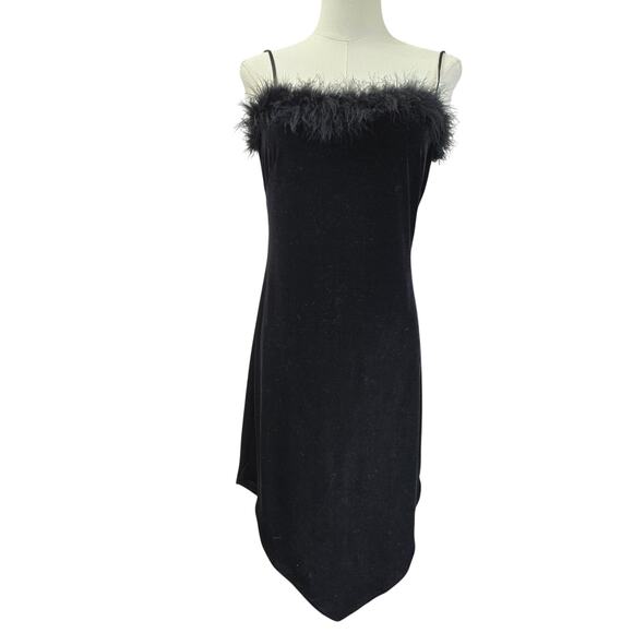 Stepping Out Vintage 90s Y2K Fairy Baddie Goth Witchy Grunge Whimsigoth Black Velvet Feather Trim Asymmetric Hem Midi Dress M LBD Punk HOCO Made In USA