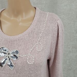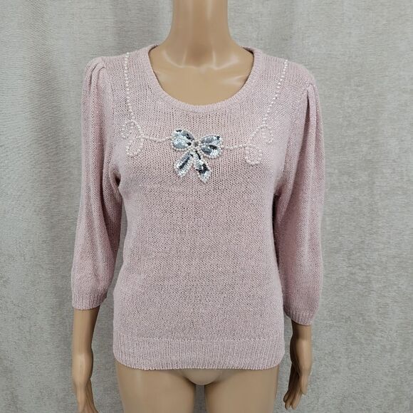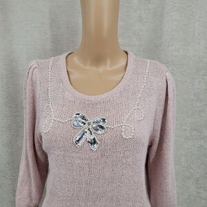 Stepping Stones Vintage Light Pink Silk Angora Blend Pearl Sequin Bow on Front