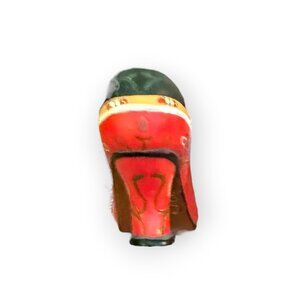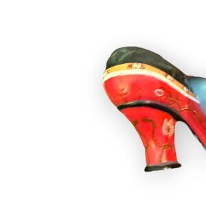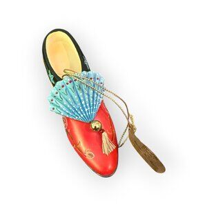 This is “Year of the Dragon,” a collectible miniature shoe ornament from the Stepping in Time Heirloom series by The Ashton-Drake Galleries. Designed by artist Joanna Widowska, this vibrant piece blends Eastern-inspired motifs with vintage elegance. It features a red front with floral detailing, a green heel, and a textured blue tongue, all accented by a gold hanging string with bell and tassel. Crafted from hand-painted resin, it measures approximately 3” long x 1.5” tall. A bold tribute to cultural celebration and ornamental craftsmanship—perfect for curio cabinets, holiday trees, or themed displays.