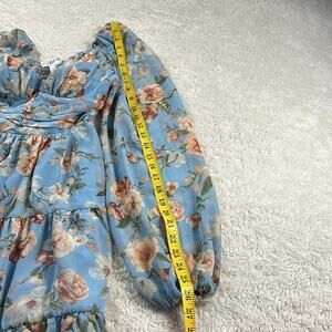 Blue floral print chiffon dress with fit and flare silhouette featuring smocked back and bishop sleeves, with sweetheart neckline, ruched waist, ruffle hem, and lightly padded cups. Pullover, with nice stretch thanks to smocking. Dainty, feminine, peasant.