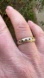 I bought this ring 30 years ago!! It’s made of sterling silver, with an engraved 14k bar that’s home to 6 small sapphires. Depending on the light, they can look navy or black. As is the case either vintage pieces, it shows signs of wear and love. It’s also a perfect stacking ring!! Size 7.75.